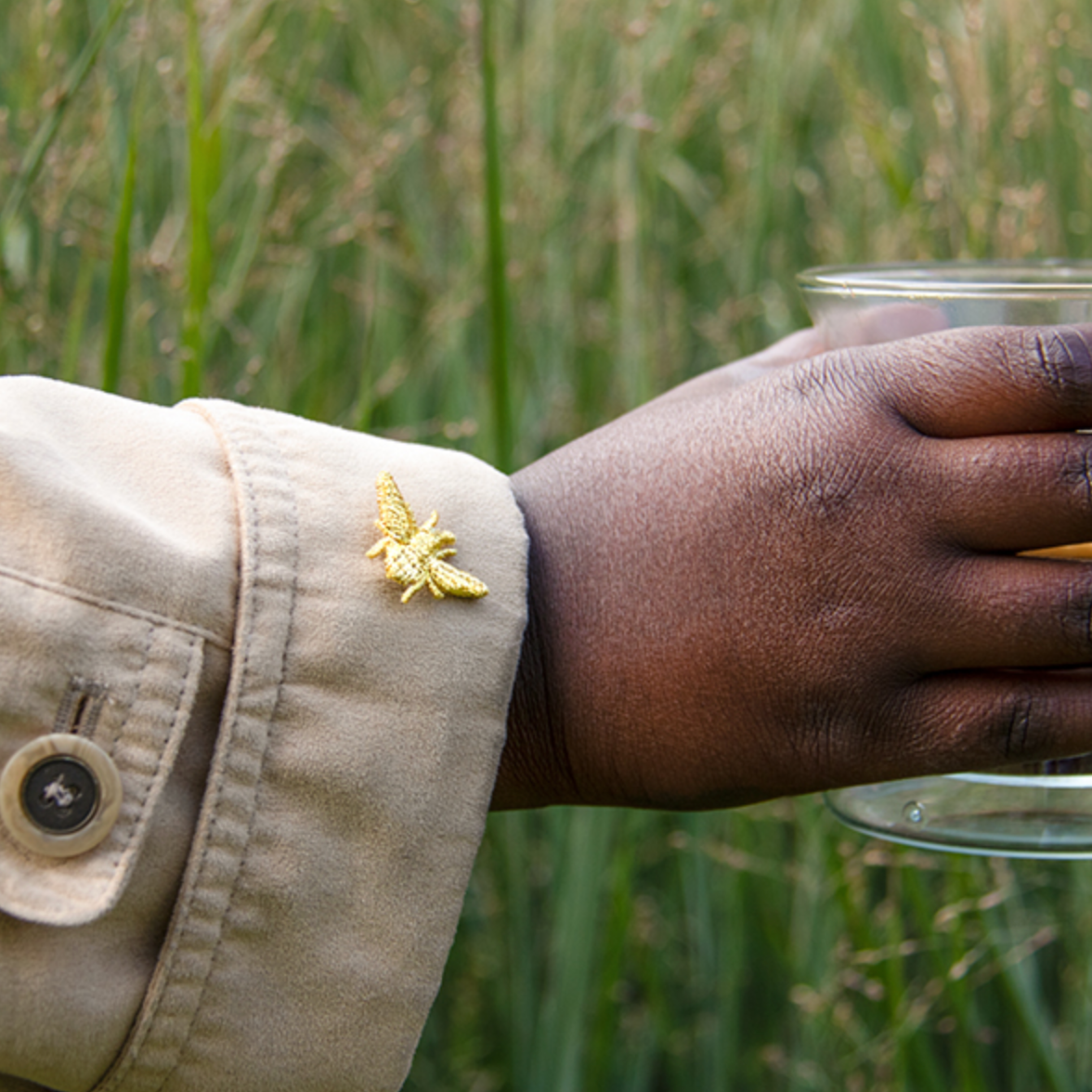 gemaakt met metallic draad. het proces is behoorlijk magisch, ze worden geborduurd op een speciale stof die oplost in water. na het wassen blijven er alleen nog enkele delicate gouden beestjes over.
