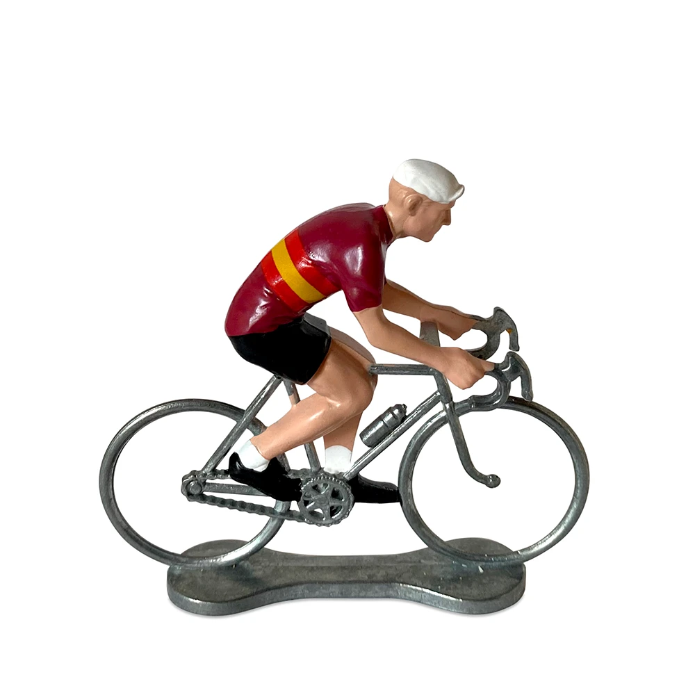 een speeltje, een spel, een vrolijk peloton van kleine fietsers. elk figuurtje, een uniek stuk met de hand geschilderd, vertegenwoordigt een land of een iconisch shirt van de tour de france.