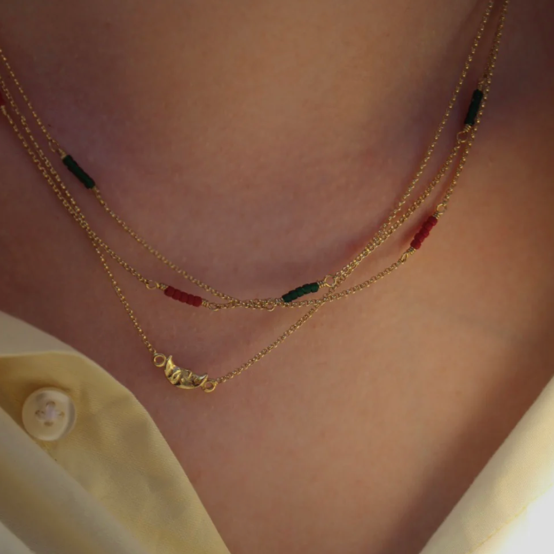 fijne halsketting met detail van speelse pareltjes.