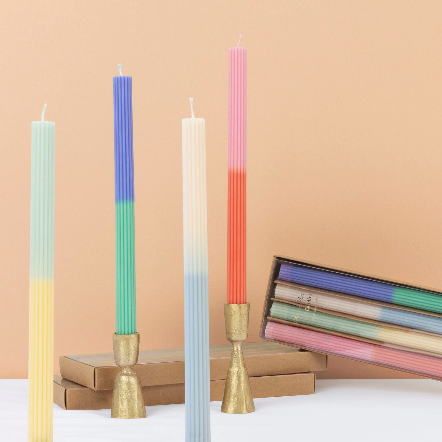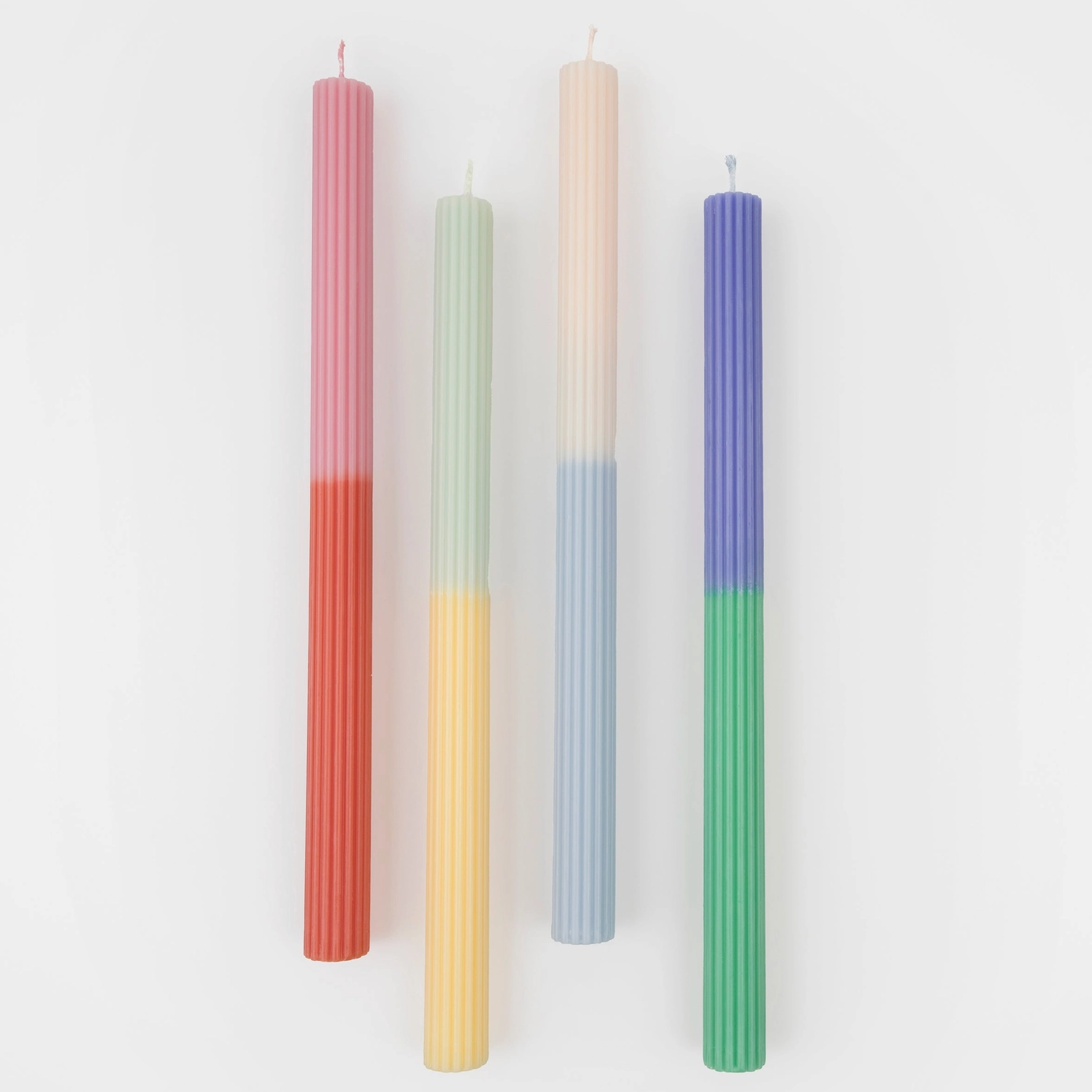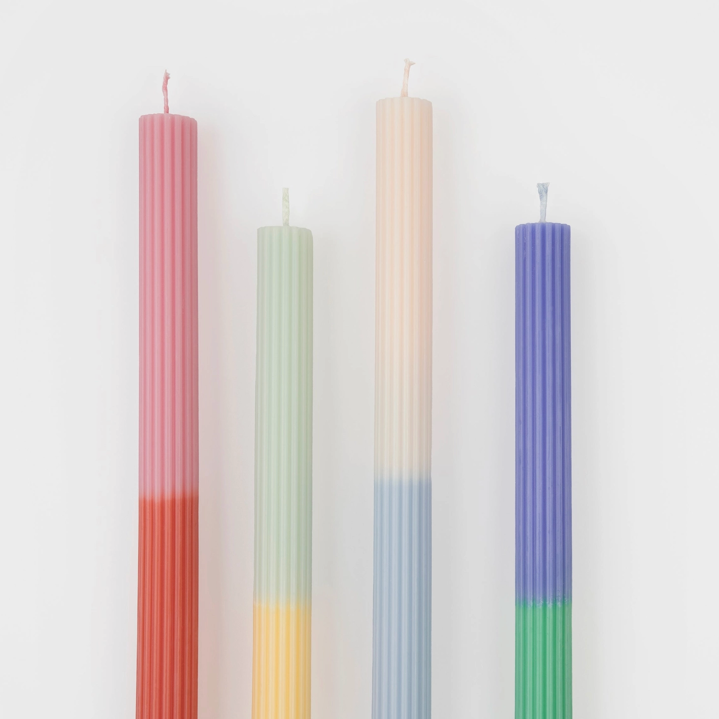 gekleurde lonten, passend bij de kleur van de bovenkant van elke kaars.