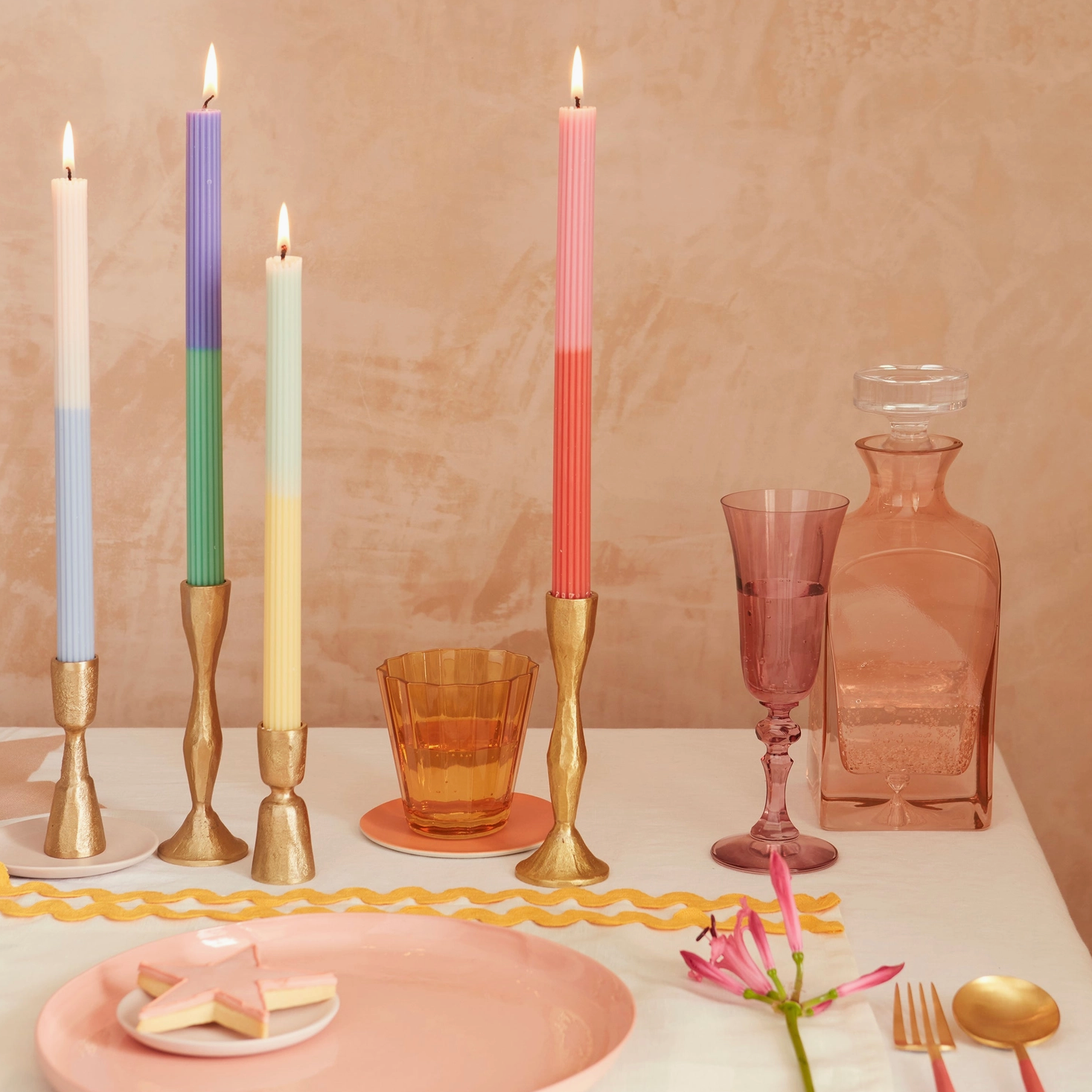 twee kleuren was per kaars. de kleuren zijn roze en rood, mintgroen en geel, perzik en lichtblauw, donkerblauw en groen.