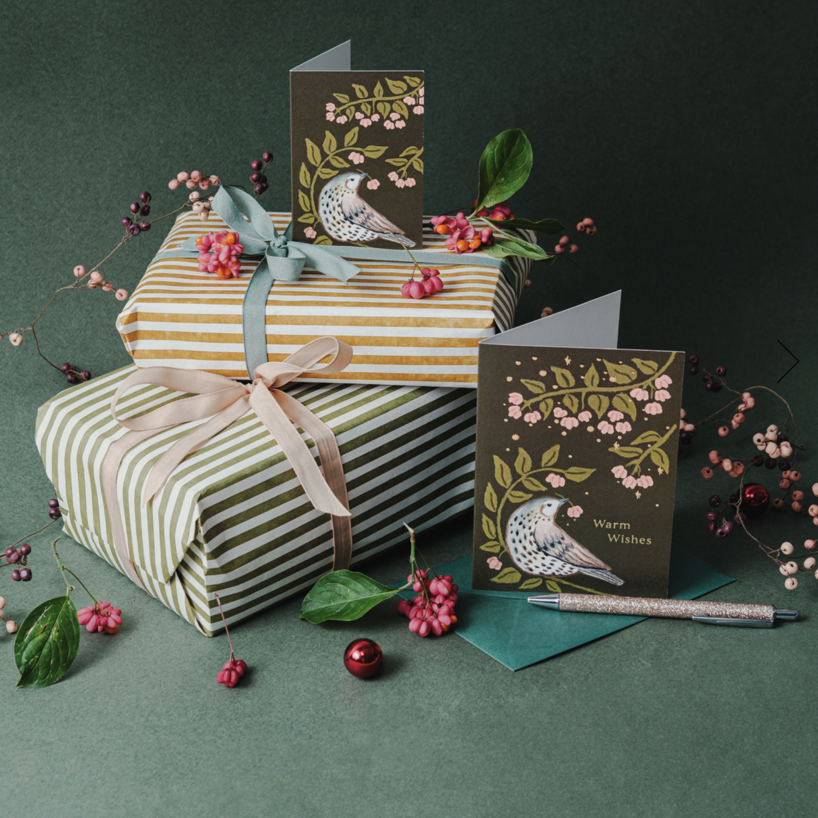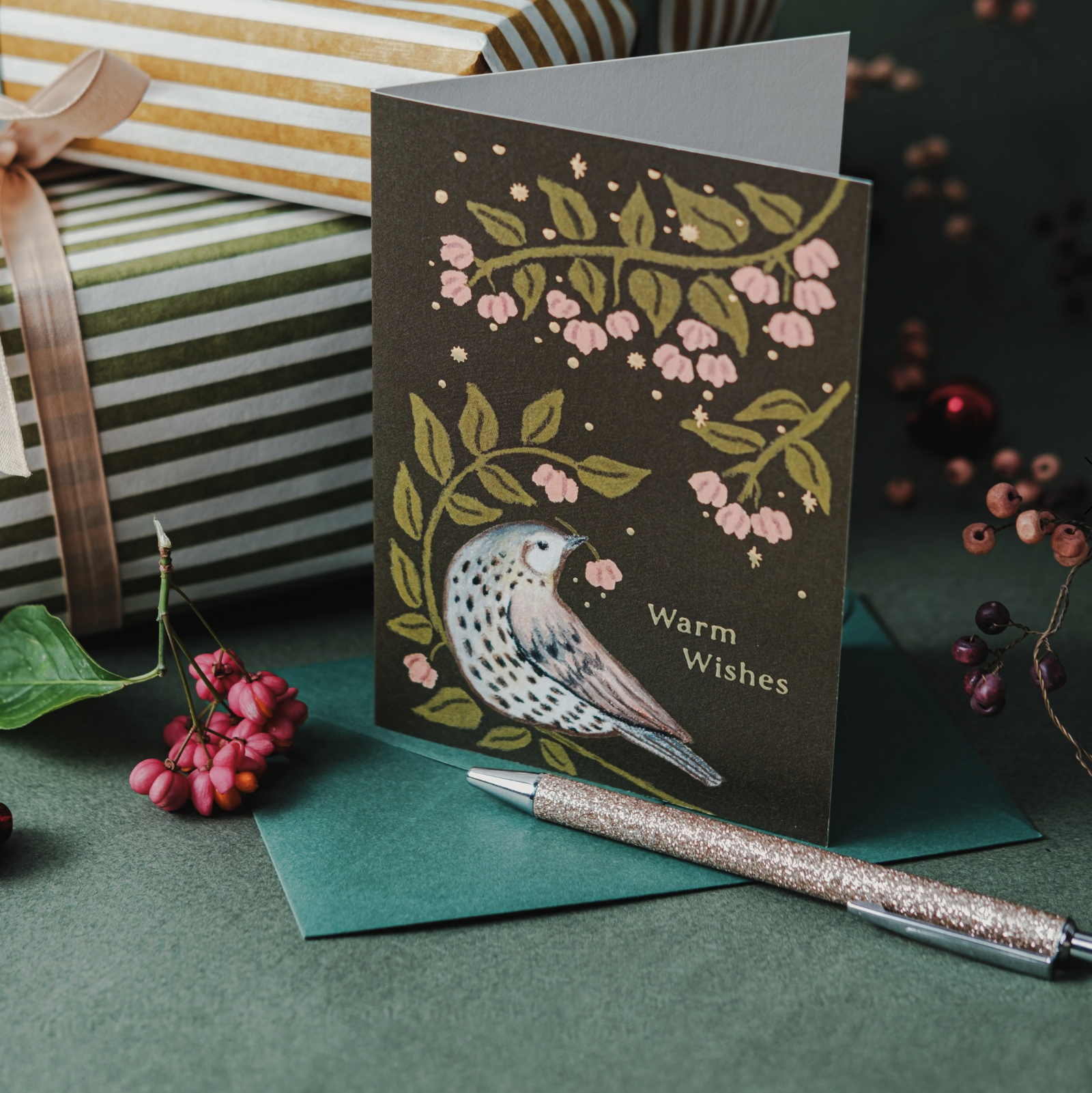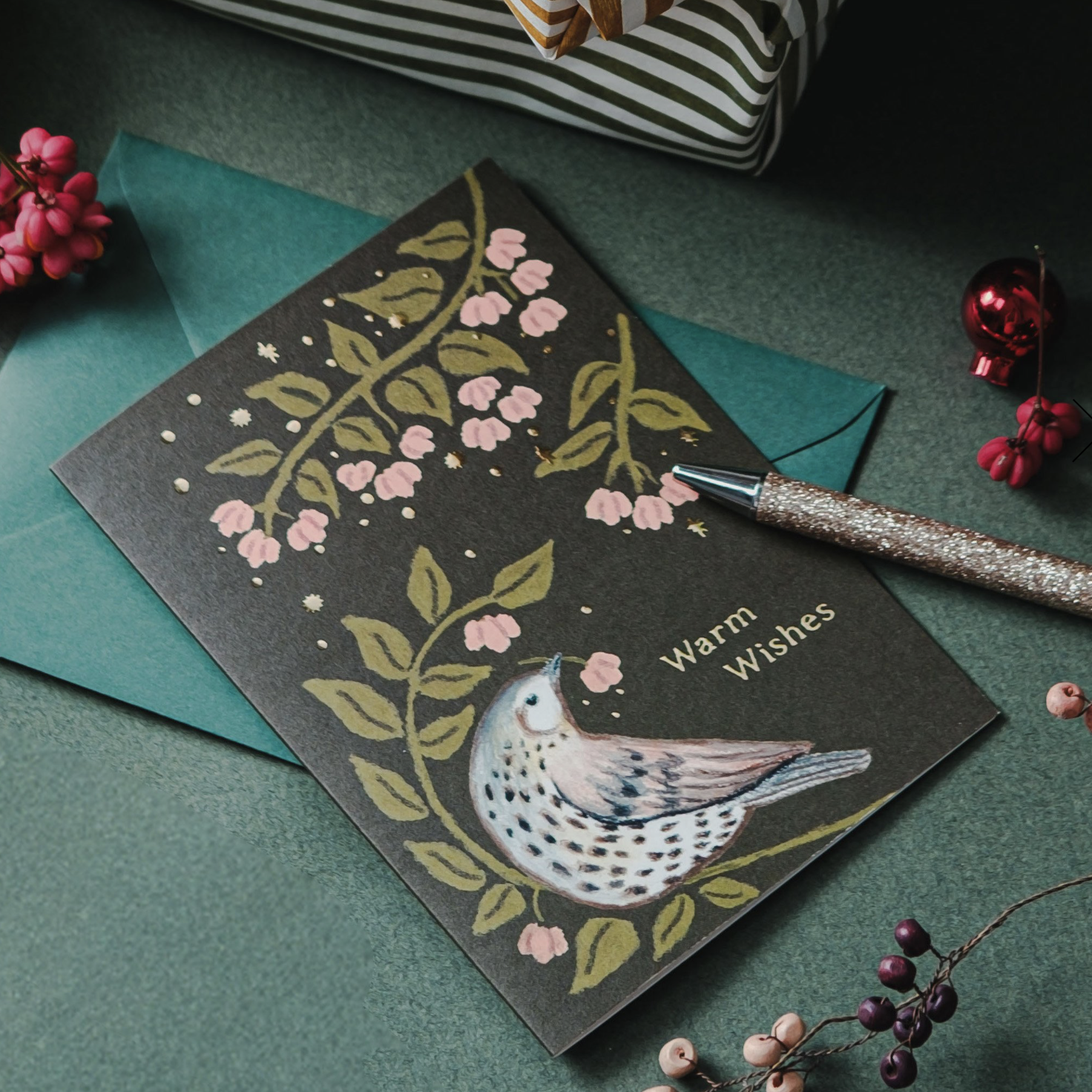 gedrukt op fsc-gecerftificeerd papier, met bijpassende donkergroene enveloppe.