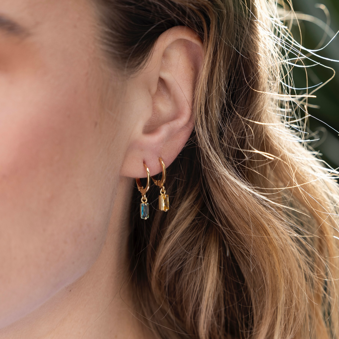 oorringetje - rechthoekig steentje blauw - verguld