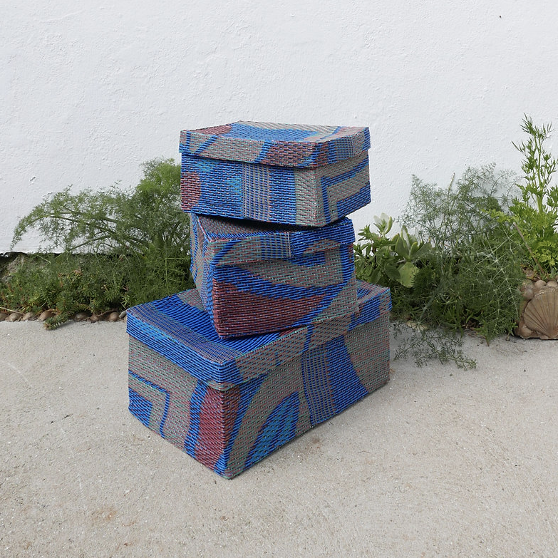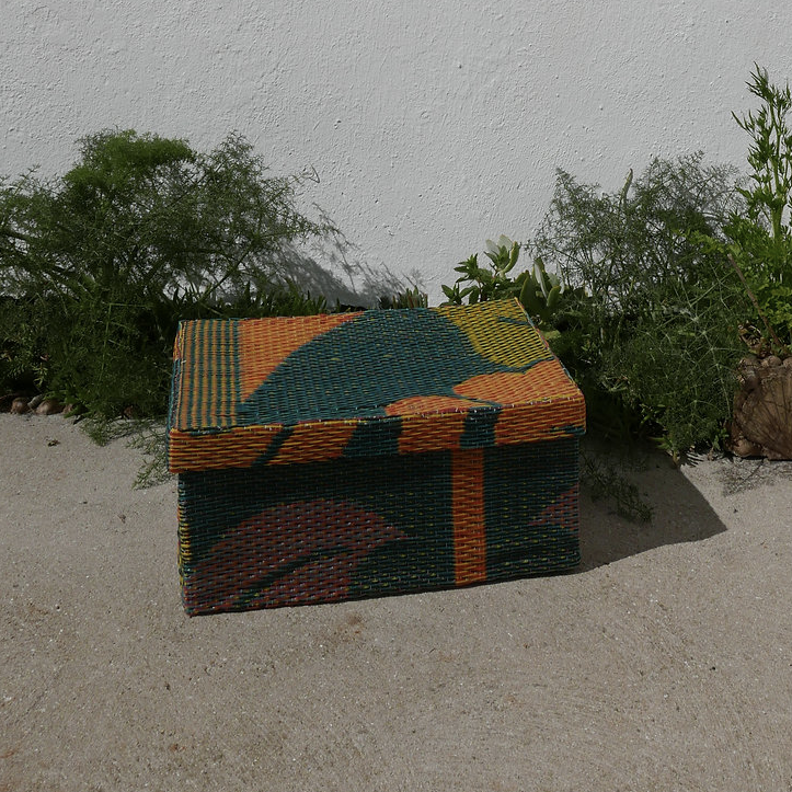 kleurrijke, met de hand geweven, rechthoekige mand met deksel.