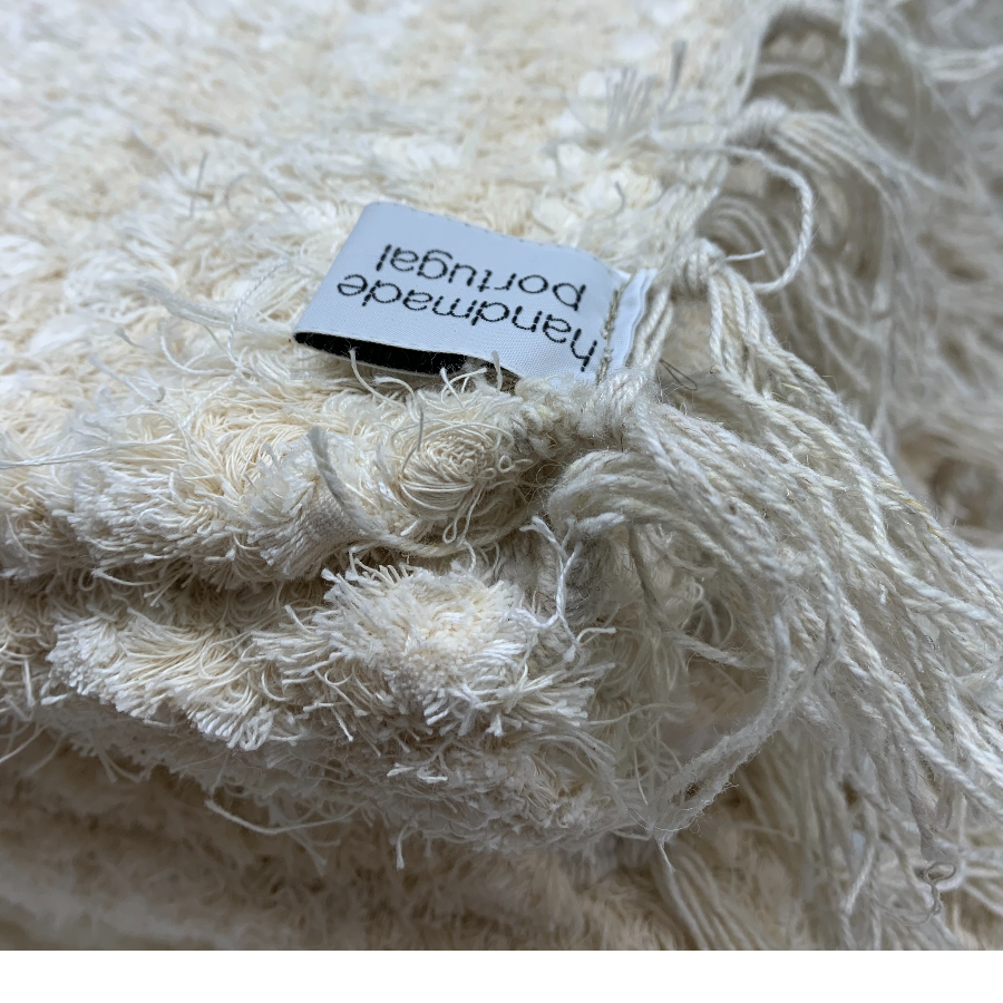 met de hand gemaakt te portugal uit restgaren afkomstig uit de kledingindustrie.