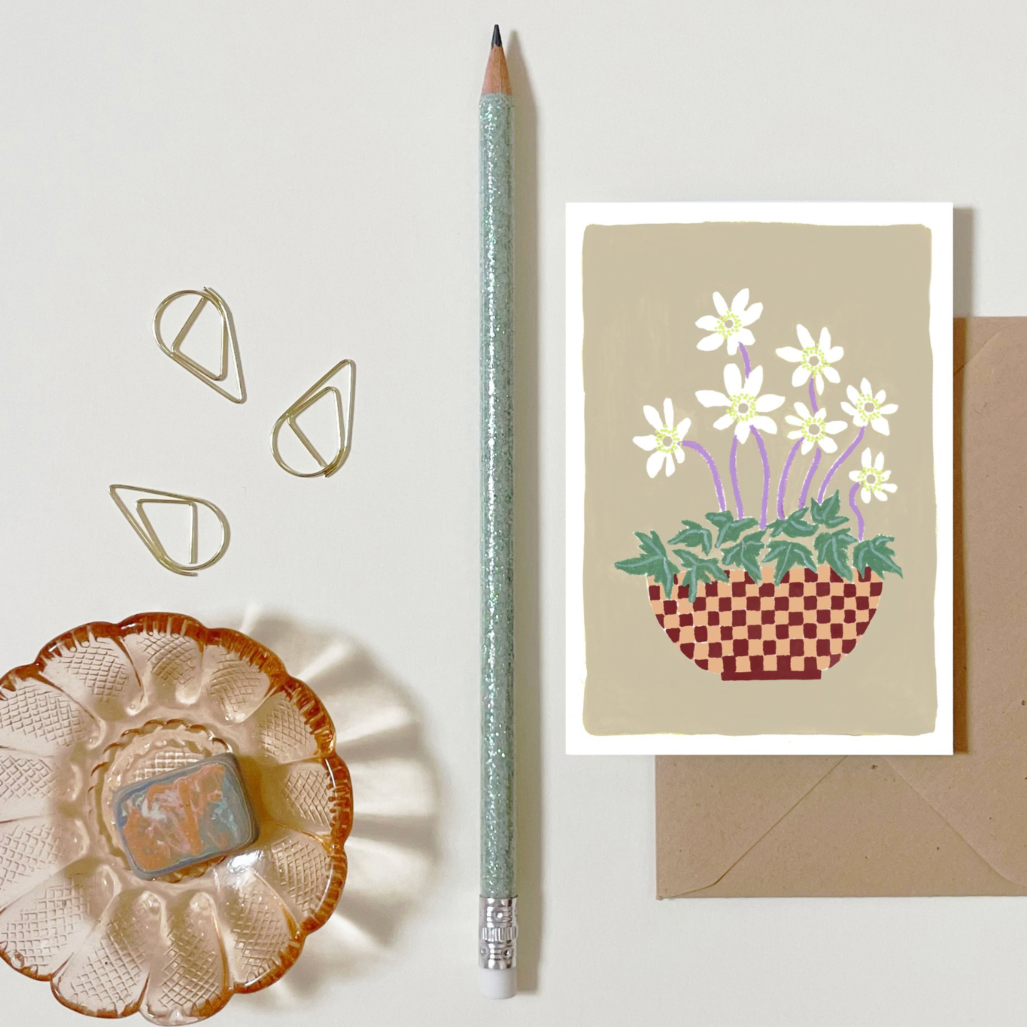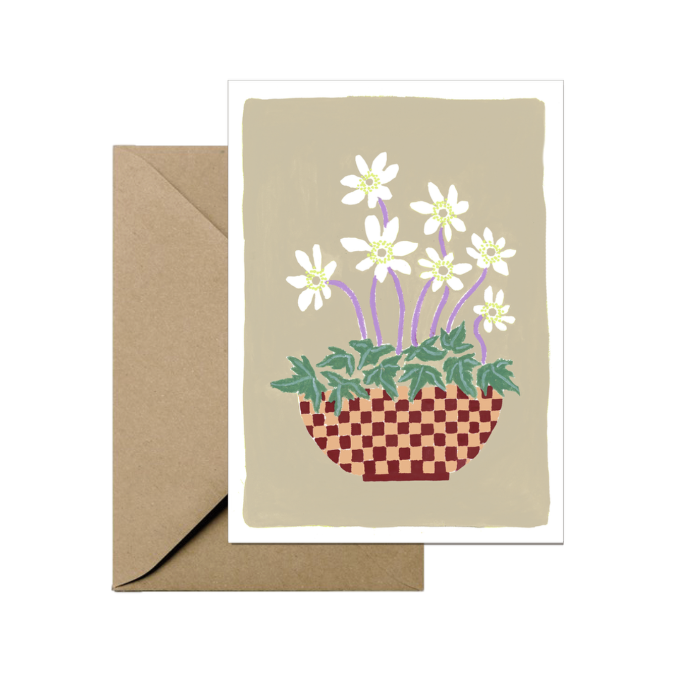 originele, dubbele a-7 wenskaart met kleurrijke florale tekening, inclusief kraftenveloppe.