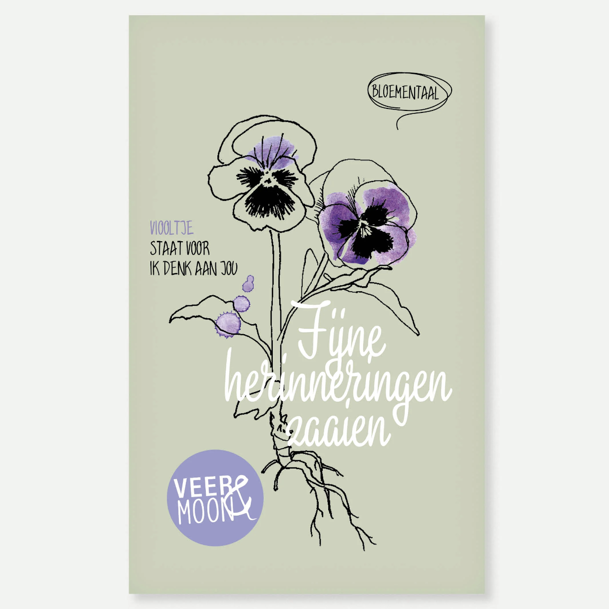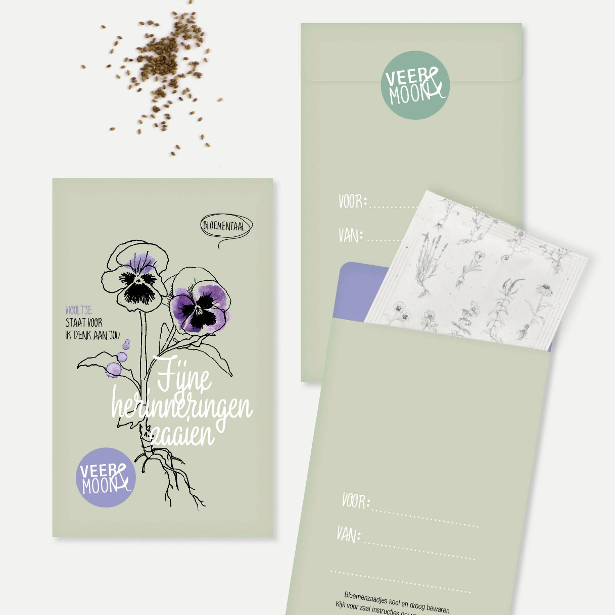 zaden van paarse viooltjes. deze bloem heeft de betekenis 'ik denk aan jou'. een mooi gebaar voor iemand met wie je fijne herinneringen deelt. je bent zeker weer in de gedachten van degene die de bloemen gaat zaaien, zodra deze opkomen.