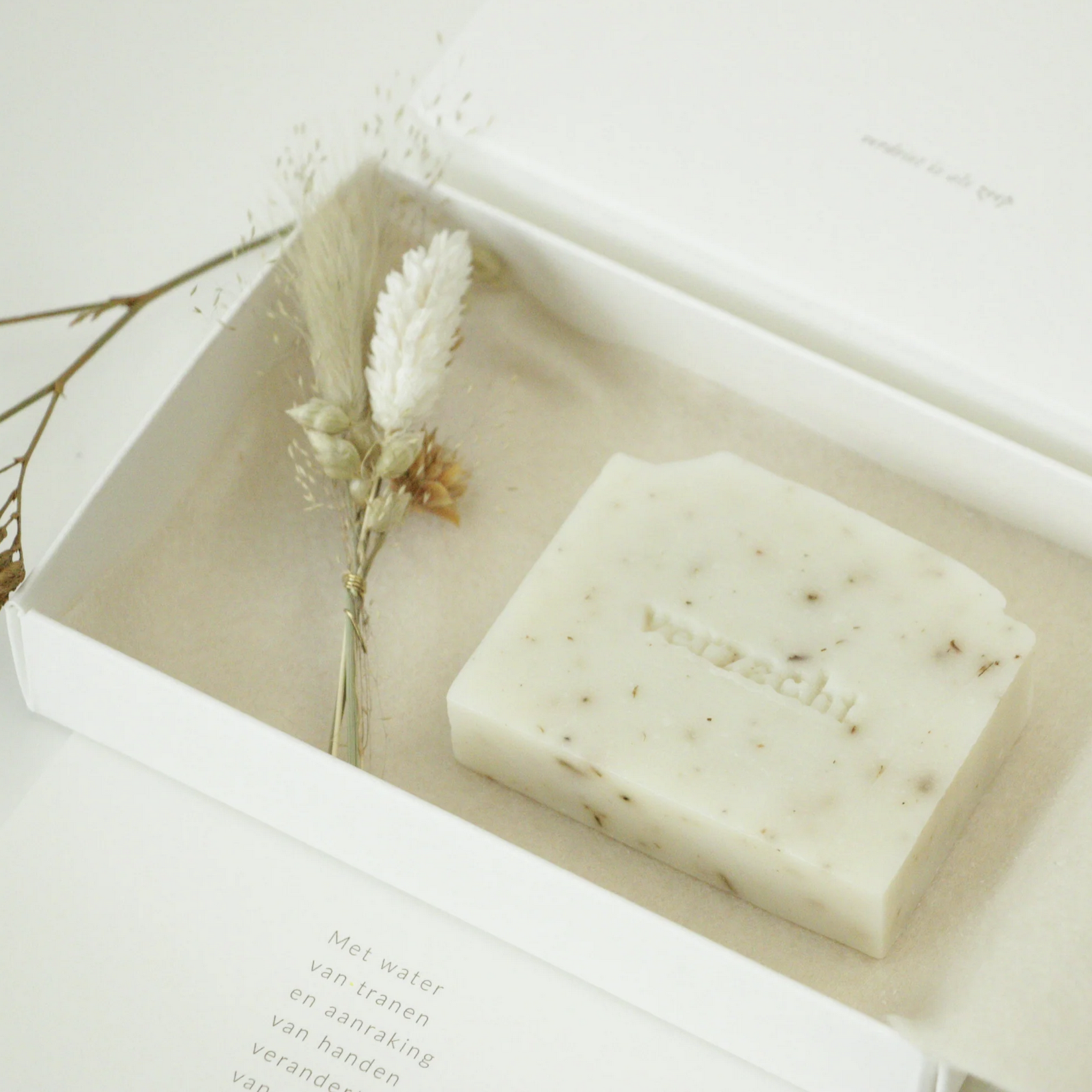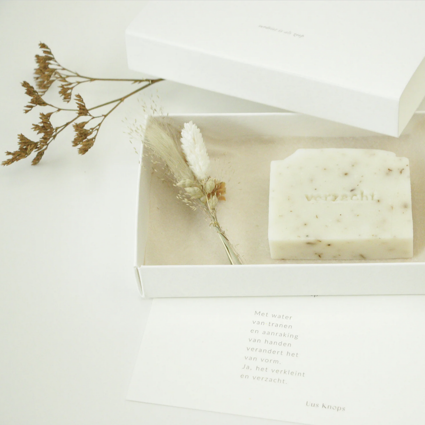 samen met een miniboeketje ligt het schattige, verzachtende zeepje in een mooi doosje. met mooie woorden van Uus Knops.